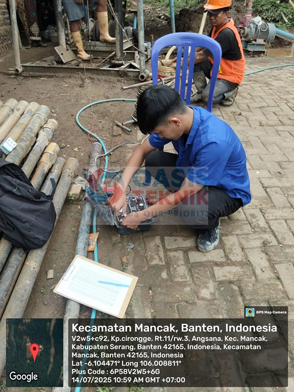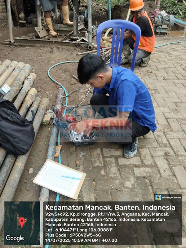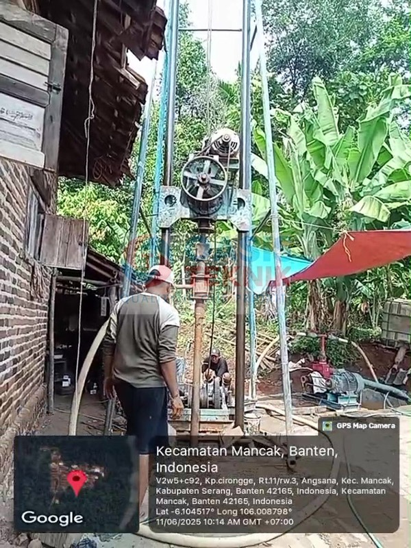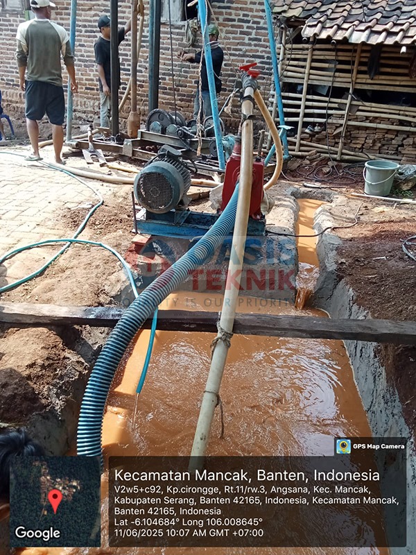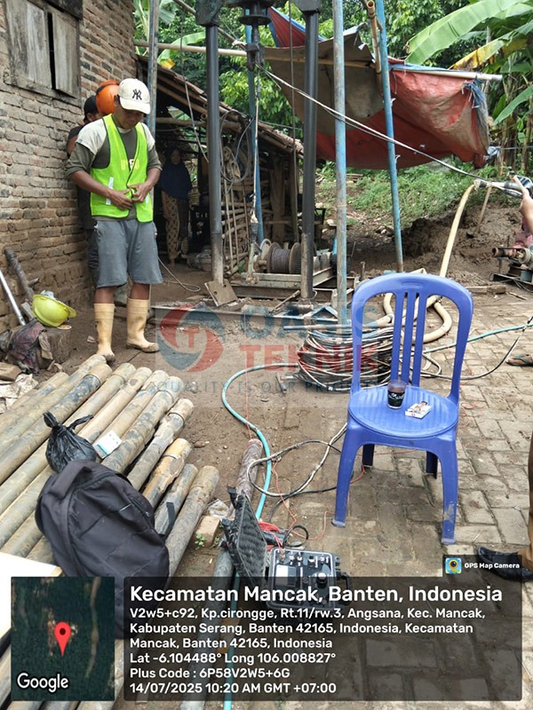 Proyek sumur bor ini dilaksanakan di Desa Angsana, Kecamatan Mancak, Kabupaten Serang dengan target kedalaman mencapai 100 meter. Konstruksi menggunakan pipa PVC berdiameter 6 inch, dirancang untuk memastikan ketahanan optimal terhadap tekanan lapisan tanah keras di lokasi.