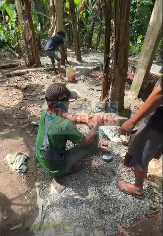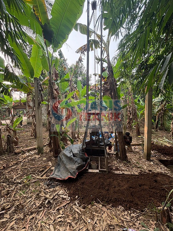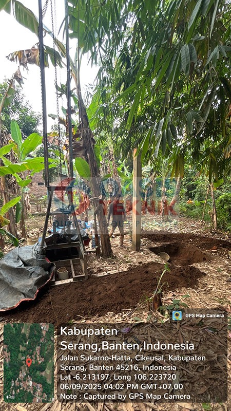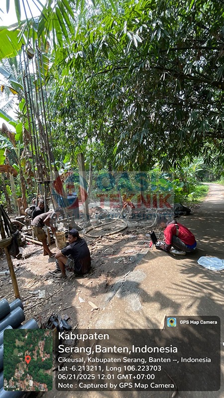 Proyek sumur bor ini dilaksanakan di Desa Sukaraja, Kecamatan Cikeusal, Kabupaten Serang, dengan spesifikasi teknis kedalaman pengeboran 110 meter dan menggunakan pipa PVC JIS berdiameter 5 inch. Berdasarkan hasil survei geologi, lokasi ini memiliki indikasi potensi gas, sehingga pelaksanaan pengeboran dilakukan secara hati-hati dan terukur untuk memastikan keselamatan kerja dan kualitas air yang dihasilkan.